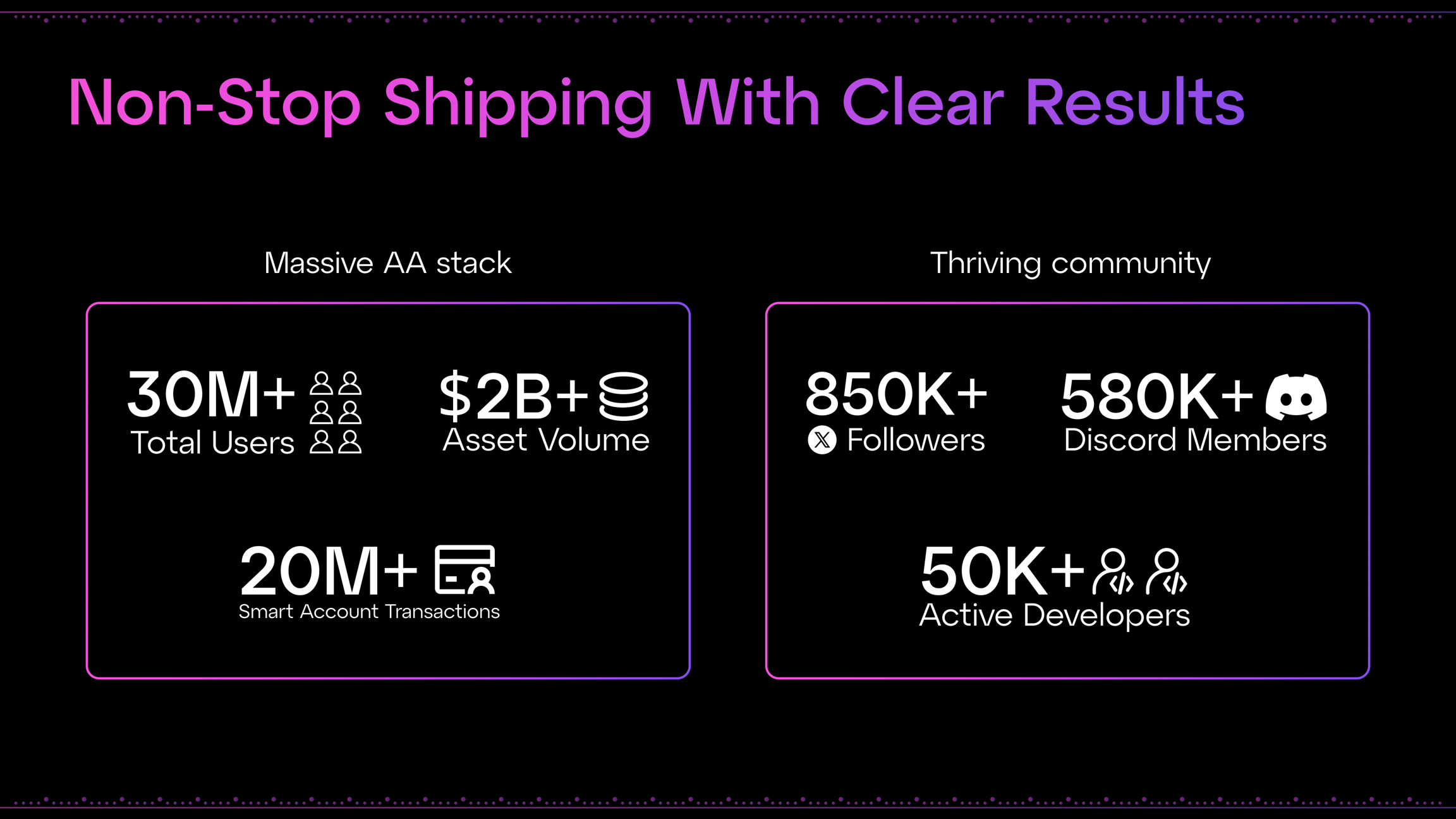 2022년에 출범한 Particle Network는 Wallet Abstraction 서비스 제공업체로 시작하여 사용자가 Web2 소셜 계정에 연결된 지갑을 생성할 수 있도록 했습니다. 이러한 지갑은 dApp에 내장된 인터페이스 내에서 네이티브로 사용할 수 있습니다. 이 제품은 이후 계정 추상화로 확대되어 Particle Network가 Web3에서 가장 큰 AA 인프라 제공업체가 되었으며, 70개 이상의 체인에 걸쳐 서비스를 제공하고 있으며 누적 UserOps 2천만, 20억 달러 이상의 자산을 보호하고 있습니다.