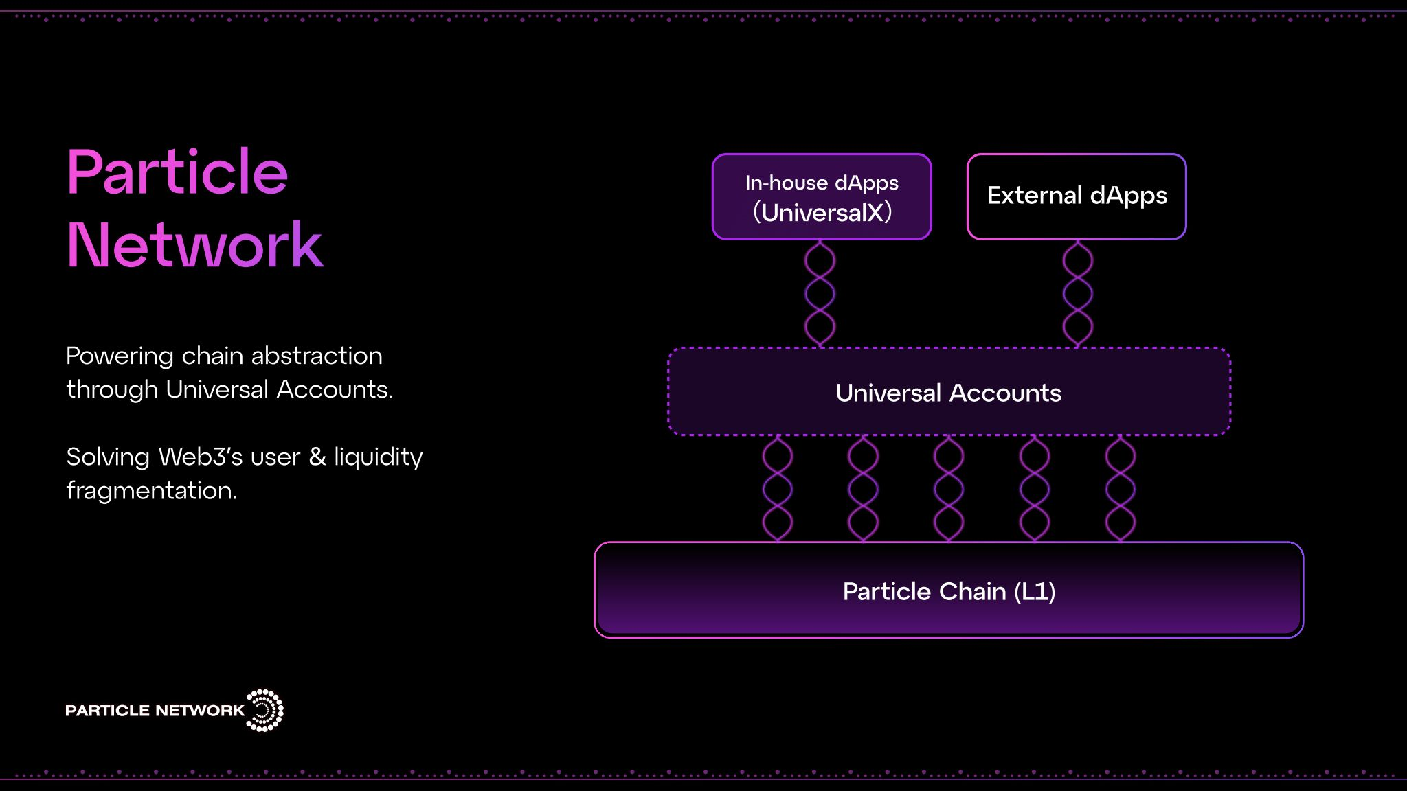 Particle Network는 Web3 전반에서 사용자와 유동성을 통합적으로 연결하는 레이어-1 블록체인입니다. 그 핵심에는 모든 체인에서 단일 계정과 통일된 잔고를 제공하는 유니버설 계정이 있습니다. 이 계정들은 Particle Network에 의해 조정되고 보안이 유지되어 Web3 생태계 전반에 걸쳐 매끄러운 경험을 보장합니다.