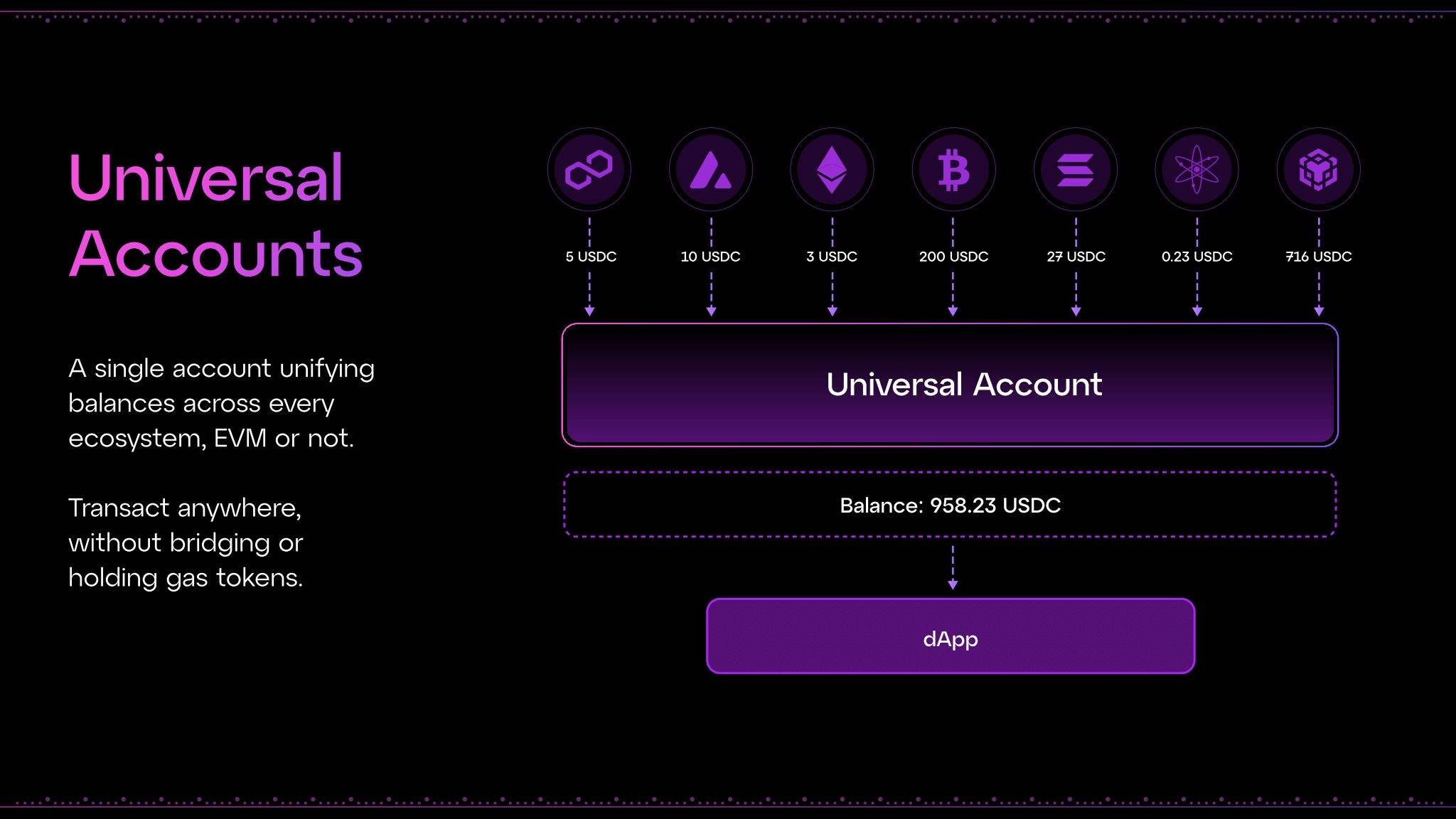 Particle Network의 주력 제품인 Universal Accounts는 사용자에게 다중 체인 Web3 생태계에 대한 단일 주소, 잔액 및 상호 작용 지점을 제공하여 진정한 체인 추상화를 가능하게 합니다. 이를 통해 수동 브리징 또는 다중 체인 지갑/자산 관리가 필요 없게 됩니다. Universal Account를 활용하는 사용자는 모든 블록체인에서 하나의 잔액 및 계정 상태를 유지합니다. 이는 특정 블록체인에 독립적인 통합 UX를 제공합니다. 기술적 측면에서 Universal Accounts는 Particle Chain에서 체인 전반에 배포 및 조정하는 특수 ERC-4337 Smart Account 구현입니다. Particle의 Universal SDK를 구현하는 프로토콜은 Particle Network의 Modular Smart Wallet-as-a-Service를 통한 소셜 로그인을 통해 검색하거나 일반적인 Web3 지갑을 연결하여 지정된 EOA 주소에 연결된 Universal Account를 할당하거나 확인합니다. 이 계정은 dApp 및 Universal Accounts를 활용하는 다른 모든 애플리케이션과 상호 작용하는 핵심 인터페이스로 사용됩니다.