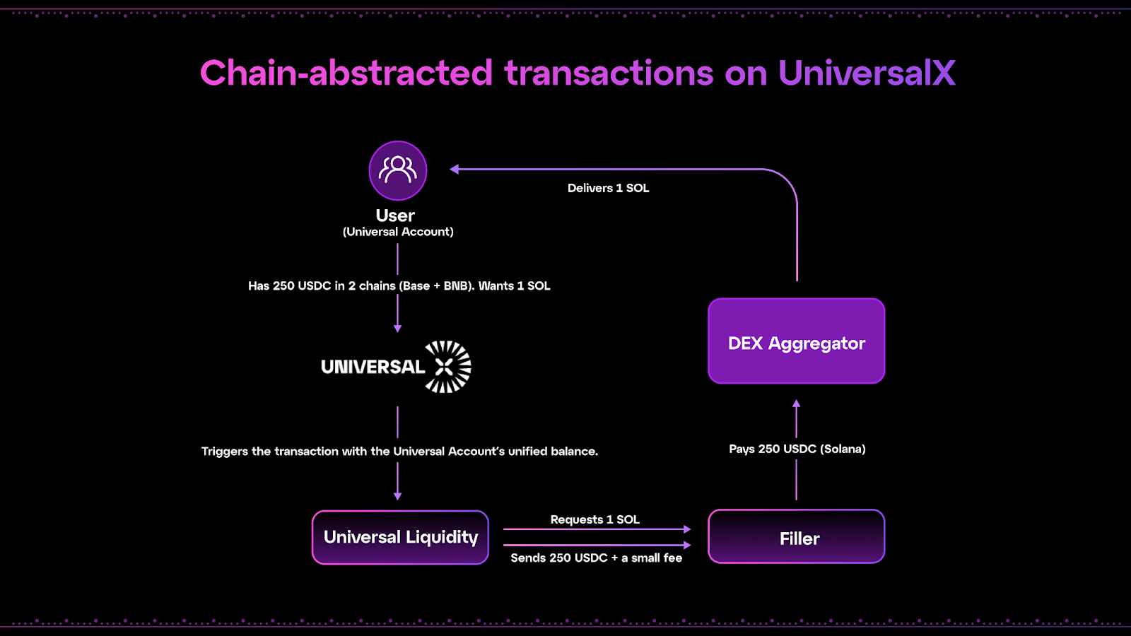 UniversalX는 Universal SDK를 통해 Universal Accounts(및 결과적으로 Particle Chain)를 최대한 활용하여 체인 추상화된 거래 경험을 제공합니다.\