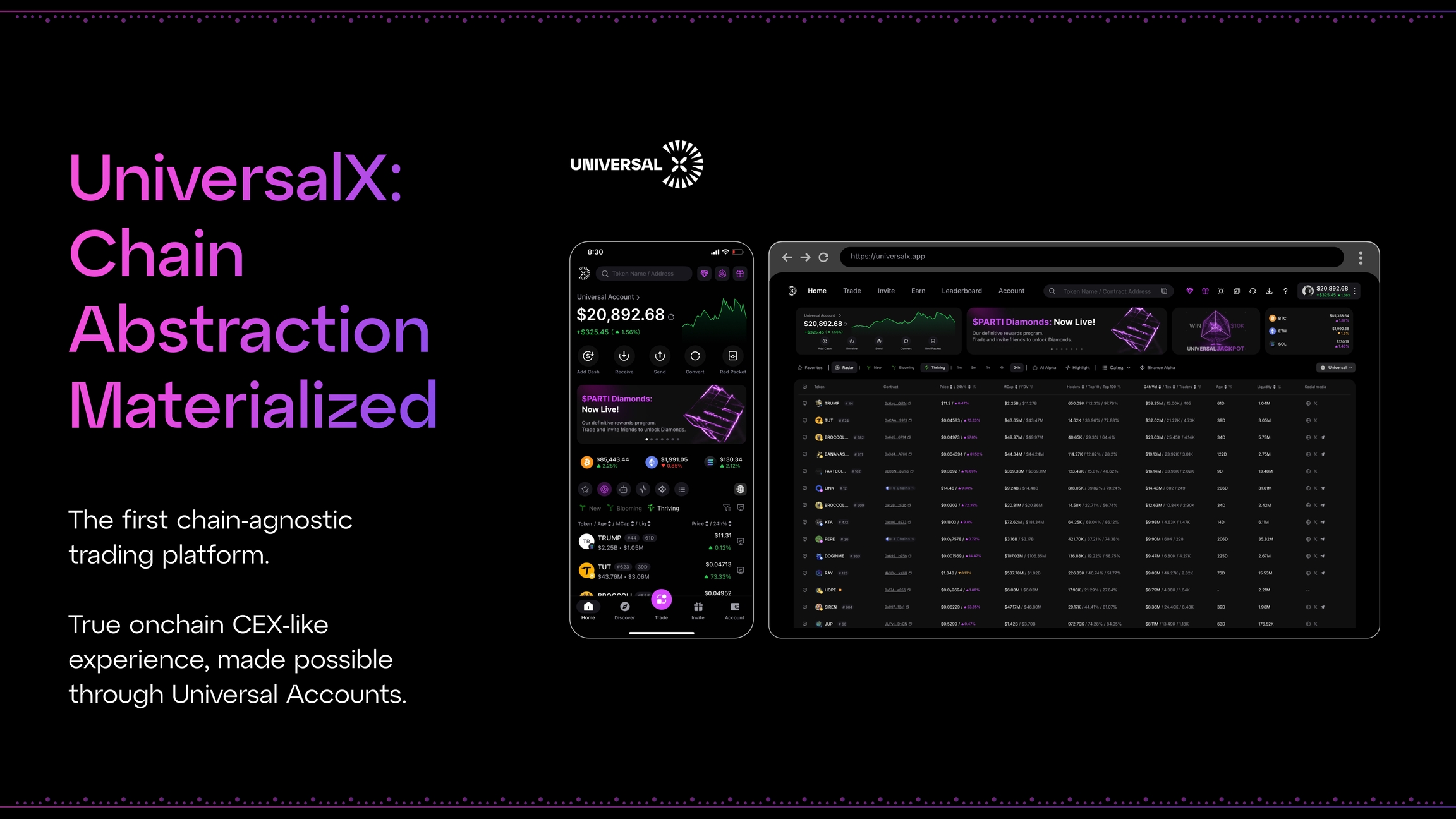 UniversalX는 체인 추상화 속성 또는 내장된 거래 기능을 위해 사용할 수 있습니다. 사용자는 다음을 수행할 수 있습니다. 다양한 지원되는 EVM 체인 및 Solana에서 토큰을 입금합니다. 토큰을 사용하여 이러한 모든 체인에서 통합된 잔액으로 거래합니다. 지연 시간 없이 모든 토큰의 가격, 온체인 및 정성적 데이터를 확인합니다. 모든 체인에서 자산을 직접 보내고 받습니다. 모든 체인에서 모든 토큰으로 가스 비용을 지불합니다. 직불 카드 또는 신용 카드, Apple Pay 및 기타 통합을 통해 현금을 사용하여 수천 개의 토큰, 심지어 미메코인을 구매합니다. 초고속 속도와 확인 시간으로 거래합니다. 완전한 MEV 보호를 누리세요. 이 모든 것이 브리징 없이 가능합니다. 실제로 UniversalX는 완전한 온체인 CEX와 동등한 경험을 제공합니다.