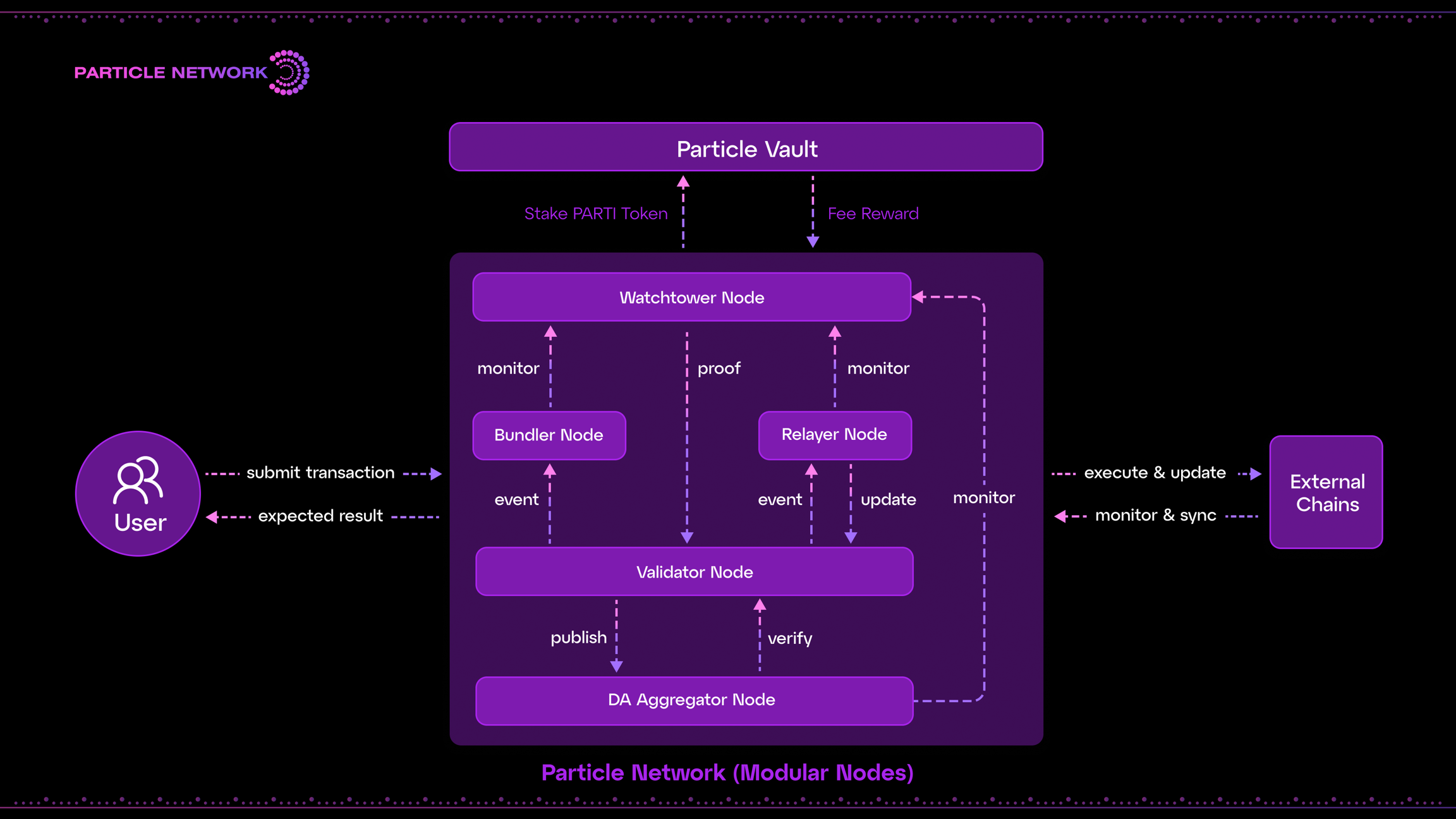 Particle Network의 모듈러 설계에는 다섯 가지 유형의 모듈러 노드가 필요합니다. 1. 검증자: 거래 검증, 외부 UserOps의 실행 상태 정산, 블록 생성 투표, Watchtower 노드에서 제출한 사기 증명 검증 참여를 담당합니다. 2. 릴레이어: 메시지 허브 역할을 하며 외부 체인 UserOps의 실행 상태를 모니터링하고 동기화하고 Universal Account 변경 사항을 동기화합니다. 3. 번들러: 외부 체인에서 UserOps의 특정 실행을 담당합니다. 4. DA 애그리게이터: Celestia, Avail, Near DA, EigenDA와 같은 다양한 DA 네트워크를 통합하고 캡슐화하여 상위 계층에 통합 데이터 게시 및 검증 인터페이스를 제공합니다. 5. 워치타워: 다른 노드의 작업을 모니터링하여 노드의 활성 상태를 보장하고, 각 에포크당 생성된 각 블록에 대한 실행 증명과 가능한 사기 증명을 제공합니다.