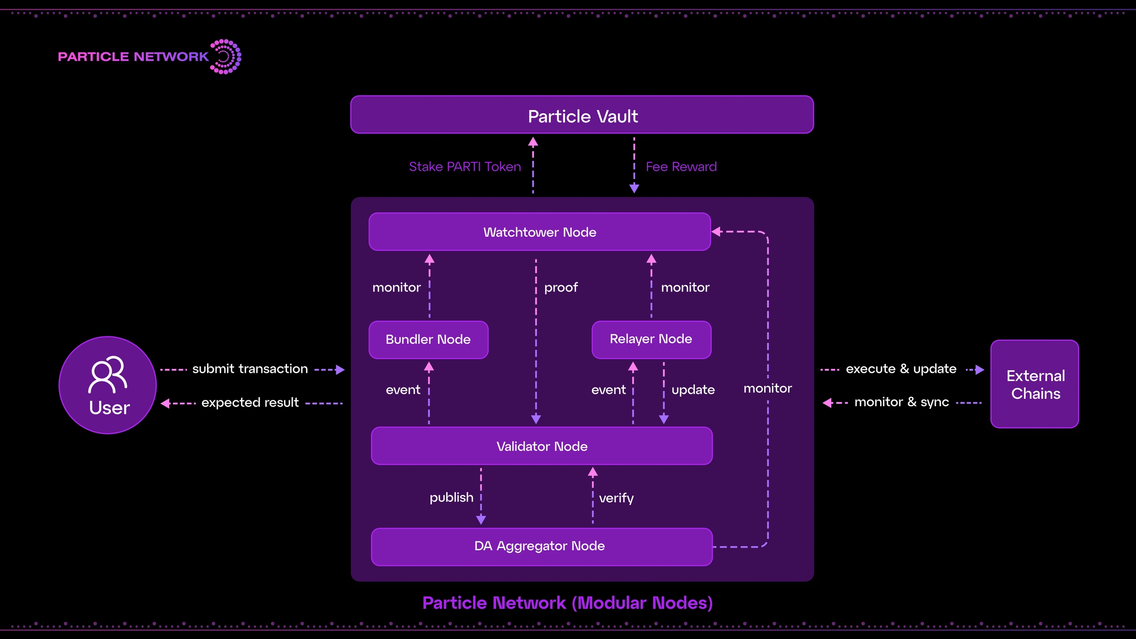 사용자는 노드를 실행하여 Particle Chain의 분산화와 보안을 지원할 수 있습니다. "모듈러 노드"는 Particle Chain에서 각각 다른 역할을 하는 다양한 유형의 노드를 통틀어 부르는 용어입니다.