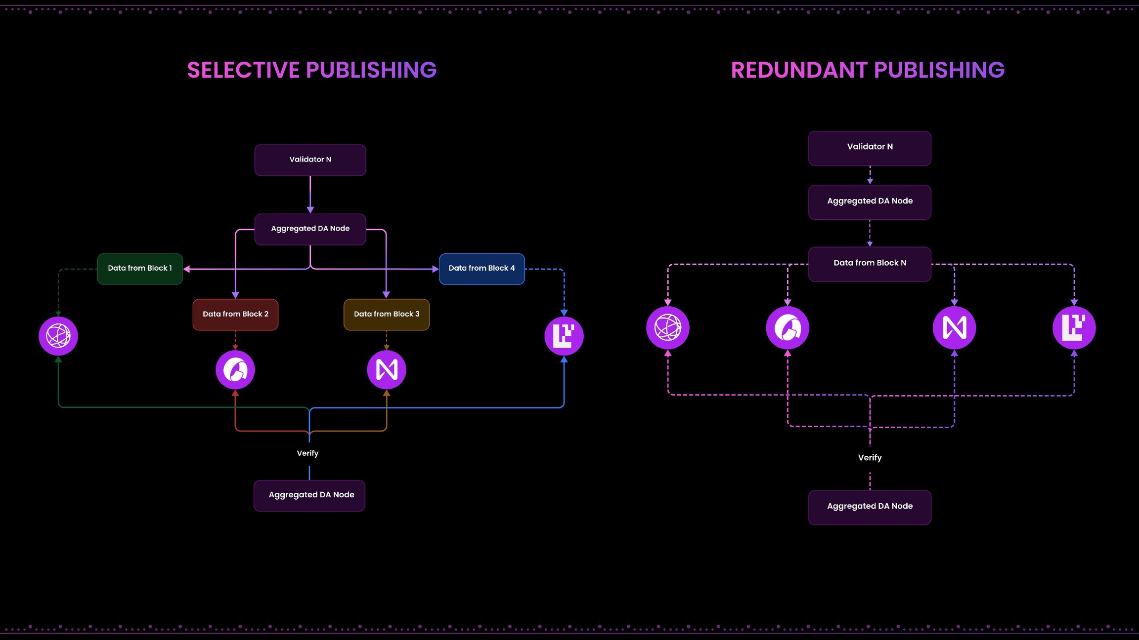 각 DA 솔루션은 고유한 이점과 성능 우선 순위를 제공하므로 하나만 활용하면 최대 보안 및 안정성 요구 사항을 충족하지 못합니다. 따라서 Particle Network는 각 블록에 대해 무작위 결정적 중복성을 활용하여 서로 다른 DA 계층 간에 데이터를 게시합니다. 이 모델은 중복성 증가와 분산화를 통해 가용성과 안정성을 크게 향상시킵니다.