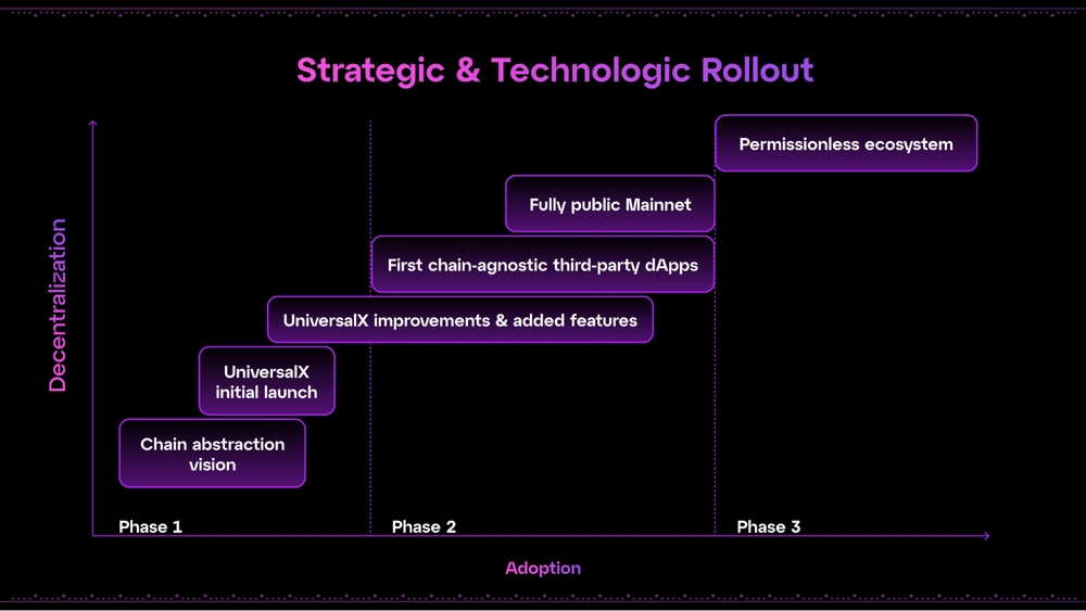 Universal Accounts는 모든 체인의 개발자와 사용자를 연결하여 국경 없는 멀티체인 생태계를 만듭니다. 체인 추상화를 채택하여 Web3의 성장을 촉진하기 위해 Particle Network는 점진적으로 고품질 애플리케이션을 개발하고 육성할 것입니다. 이 프로세스는 세 단계로 나뉩니다. 1. 허가형 생태계(Q1, 25): 현재 Particle Network 팀은 Universal Accounts를 활용하는 핵심적이고 고품질의 애플리케이션을 구축하고 있습니다. UniversalX는 이미 모든 체인의 결합된 잔액으로 온체인 거래를 가능하게 하는 최초의 체인 독립적인 메인넷 애플리케이션으로 출시되었습니다. 앞으로 Particle은 생태계를 계속 육성하기 위해 기본 사용 사례를 다루는 두 개의 체인 추상화 애플리케이션을 더 출시할 것입니다. 2. 협업형 생태계(Q3, 25): 이 단계에서 Particle Network는 주요 생태계 파트너와 협력하여 AI, 거래, 스테이블코인과 같은 중요한 수직 분야에서 기존 및 새로운 애플리케이션 모두에서 Universal Accounts를 활용할 것입니다. 3. 허가 없는 생태계(Q1, 26): 이 단계에서는 모든 생태계 행위자가 허가 없이 Universal Accounts를 통합할 수 있습니다. 퍼블릭 체인은 UA를 생태계에 배포하여 Particle Network에 연결할 수 있습니다. 마찬가지로 모든 애플리케이션 개발자는 이를 dApp에 통합하여 사용자가 모든 애플리케이션과 퍼블릭 체인에서 최상의 경험을 즐길 수 있도록 합니다.
